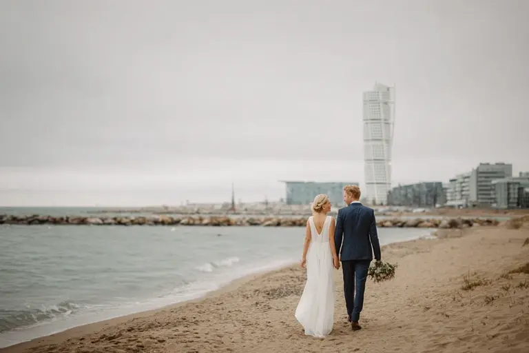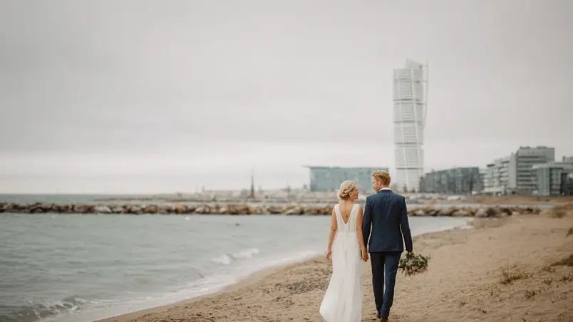 Brudpar som går längs Ribersborgsstranden i Malmö