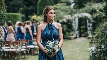 Marinblått är den nyans som oftast dyker upp på bröllop med klädkoden mörk kostym, och det finns goda skäl till det – färgen fungerar dessutom utmärkt som långklänning till bröllop i formella sammanhang. Färgen signalerar formalitet utan att kännas stel och fungerar lika bra vid en vintervigsel i kyrka som vid en höstfest på slott. Tänk dock på att marinblått i vissa ljusförhållanden kan upplevas nästan svart, särskilt inomhus med dämpad belysning. Välj gärna ett material med lite lyster, som satäng eller crepe, så att nyansen kommer till sin rätt även på kvällsbilder.