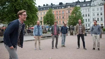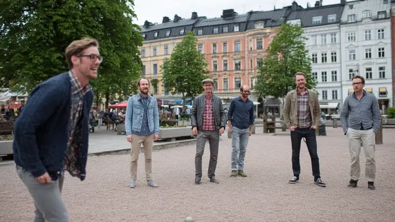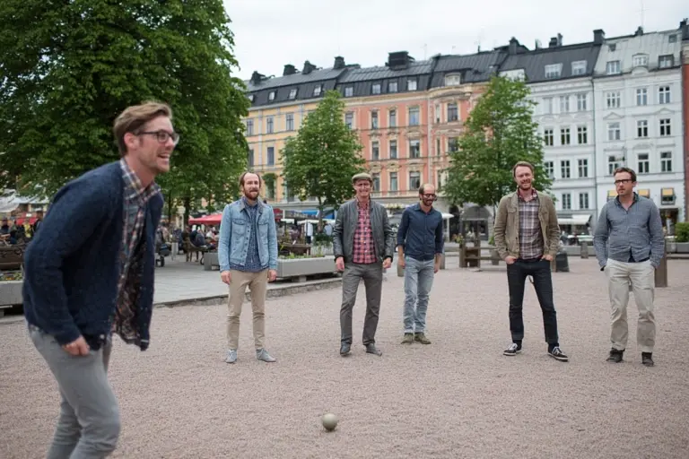 Grupp vänner som spelar boule utomhus i Malmö centrum